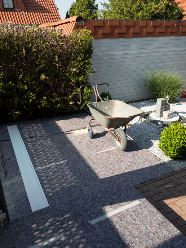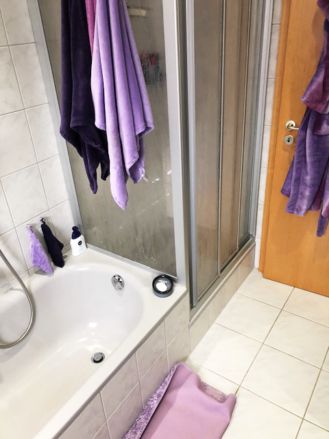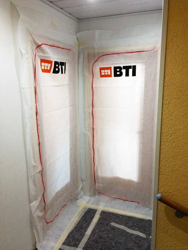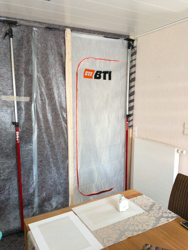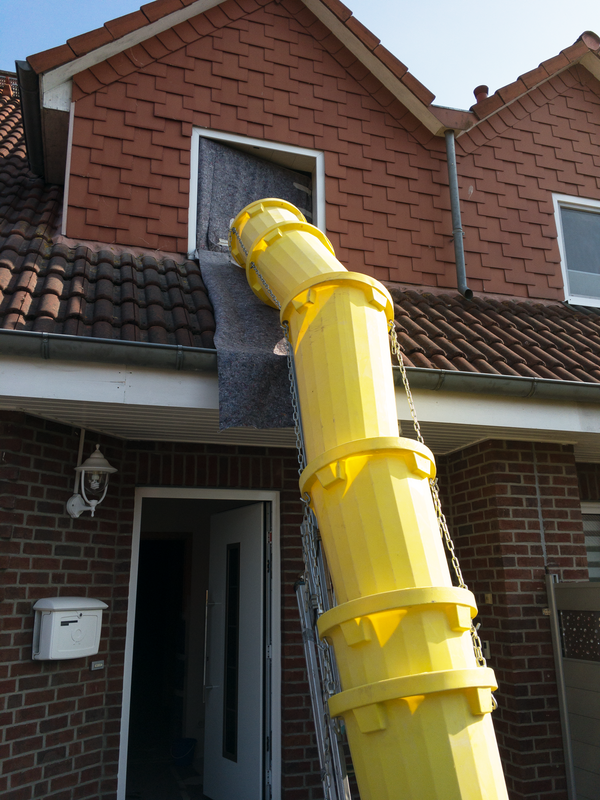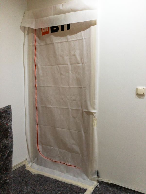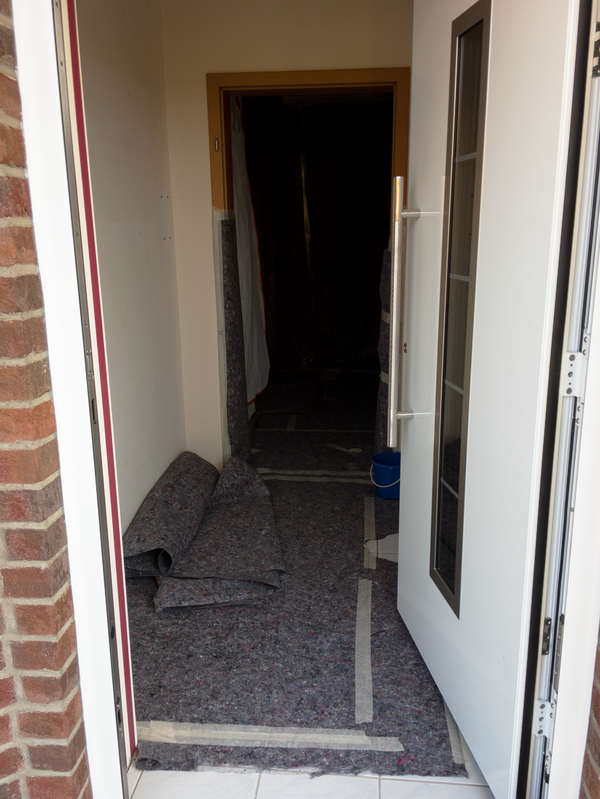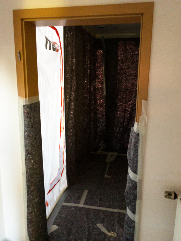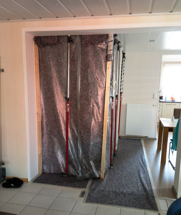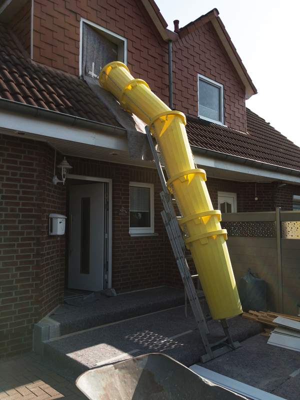 Zum Schutz des offenen Wohnbereiches im Erdgeschoss haben wir für das Badezimmer im 1. Obergeschoss eine Staubschutzwand mit Staubschutztür errichtet. Dadurch wird die Verschmutzung der restlichen Wohnräume auf ein Minimum reduziert. Die sich auf dem Laufweg befindenden Türen, Bodenbeläge und Treppen wurden mit Maler-vlies abgedeckt. Zur besseren Entsorgung des Bauschutts wurde eine Schuttrutsche montiert. Mit ihr musste der Bauschutt nicht durch das Haus getragen werden.