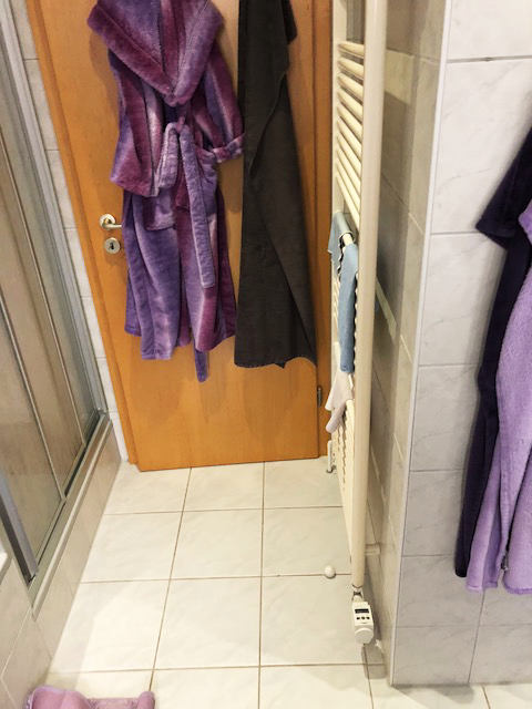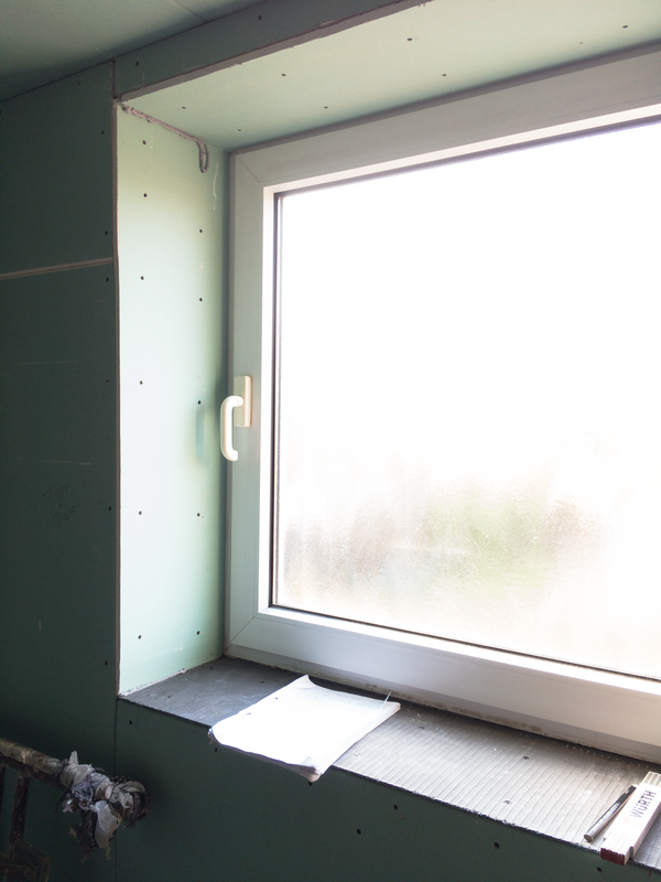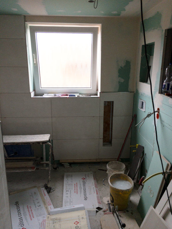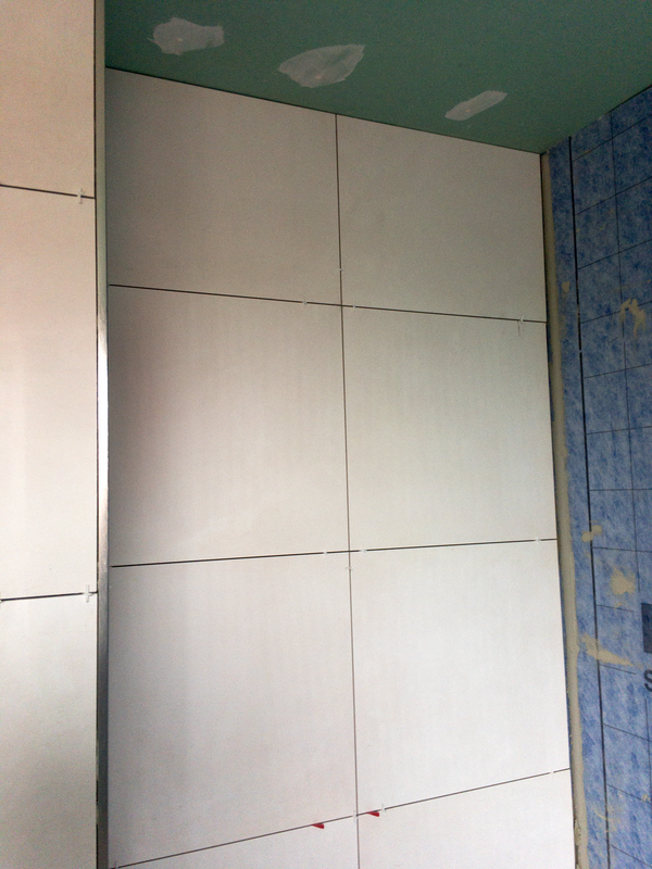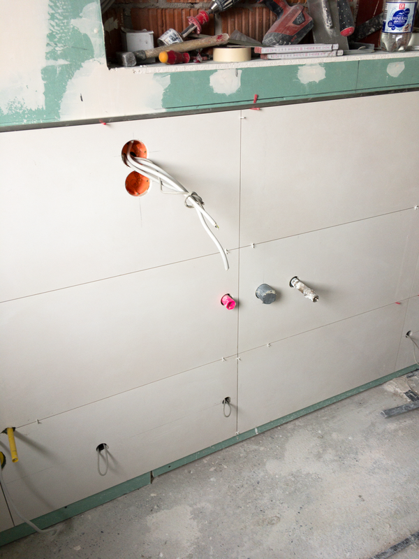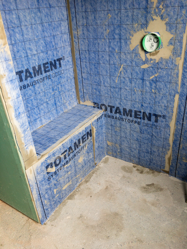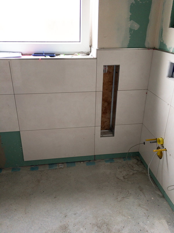 Bevor wir die Abdichtung in der Dusche installiert haben, mauerten wir einen Sitz in die Dusche. Um die Schädigung der Bausubstanz durch eindringende Feuchtigkeit zu verhindern, wurde eine Abdichtung im Duschbereich angebracht. Im Anschluss folgten die Fliesenarbeiten im Duschbereich. Mit einem Fliesenformat von 40 cm x 80 cm wurden die ersten Fliesen in der Dusche verlegt. Durch die großen, kalibrierten Fliesen entsteht eine sehr schmale Fuge.