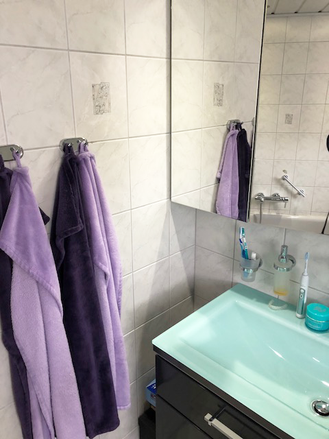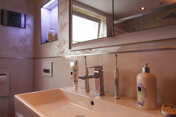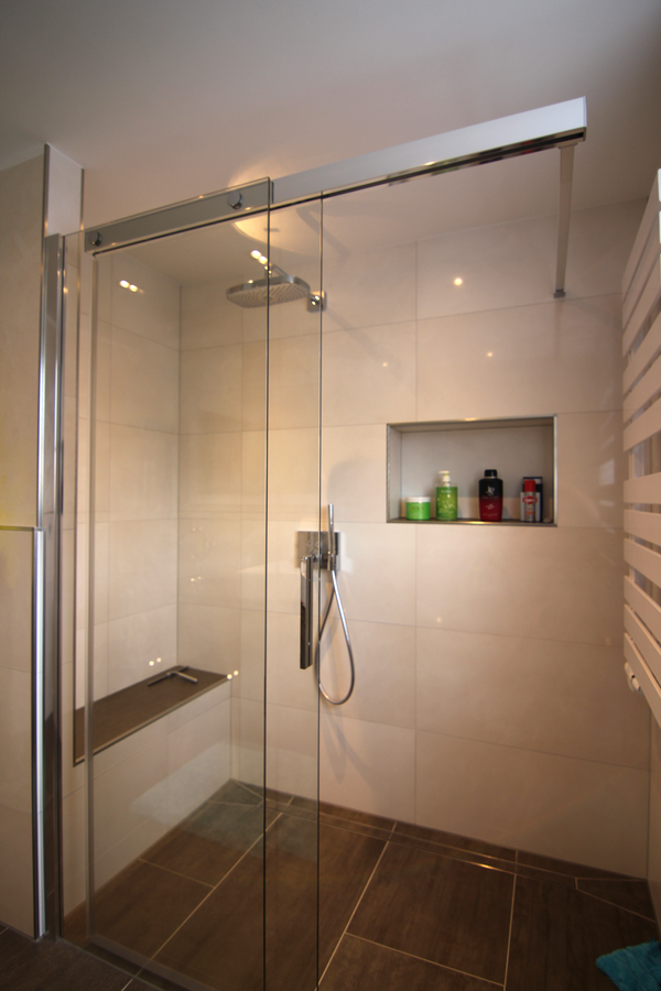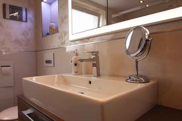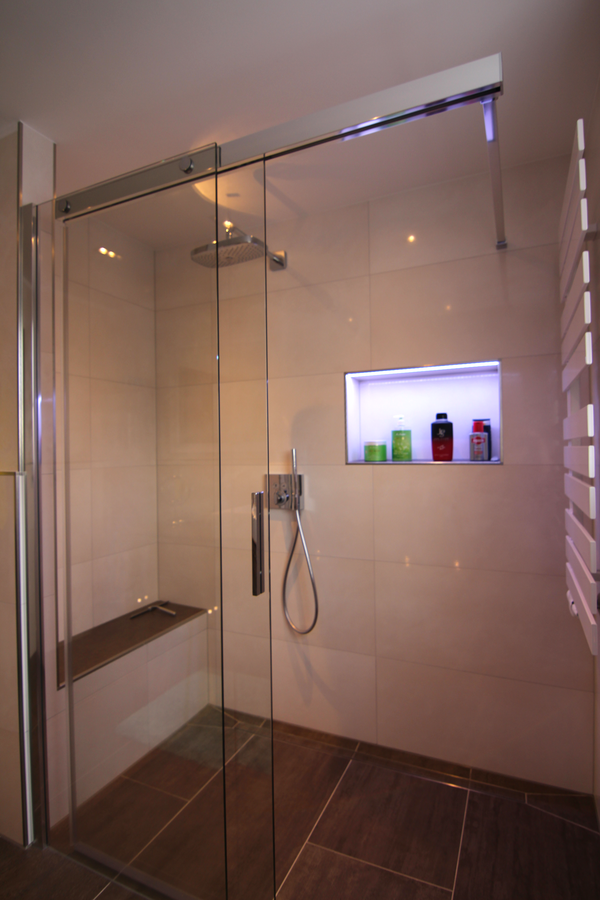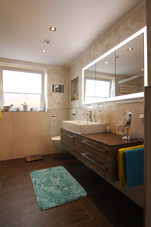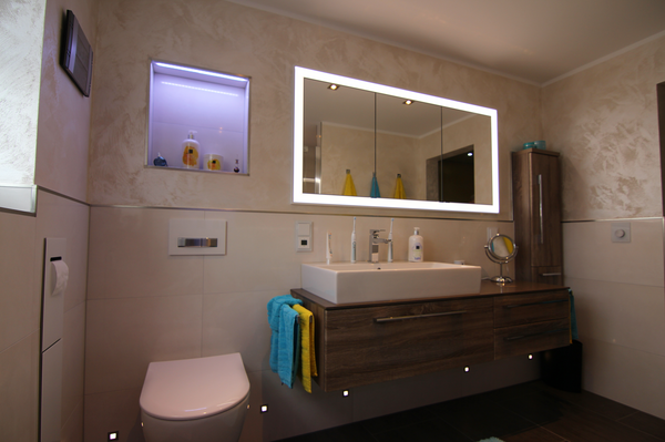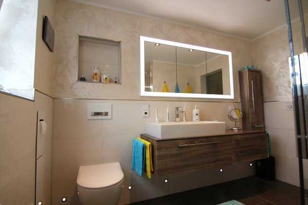 Nach Fertigstellung der Fliesenarbeiten und des Ballotini Putzes an den Wänden, erfolgt die Fertigmontage des Badezimmers. Diese beinhaltet die Montage der Waschtischanlage mit einer Kunststeinplatte und aufgesetztem Waschtisch, der Unterschränke und des Seitenschrankes. Dadurch entsteht viel Stauraum im neuen Bad. Der in die Wand eingelassene Spiegelschrank wirkt elegant und bietet versteckte Aufbewahrungsmöglichkeiten. Der bodengleiche geflieste Duschbereich ist großzügig geschnitten und mit einer gefliesten Sitzbank ausgestattet. Die Armaturen sind durch die Unterputz-Montage pflegeleicht. Die Nischen in den Wänden bieten eine praktische Ablagefläche und sind mit einer indirekten Beleuchtung (mit Farbwechsel) ausgestattet. Ein besonderes Highlight dieses Badezimmers, sind die Nachtlichter am WC und unter dem Waschtisch, die durch Bewegung aktiviert werden.