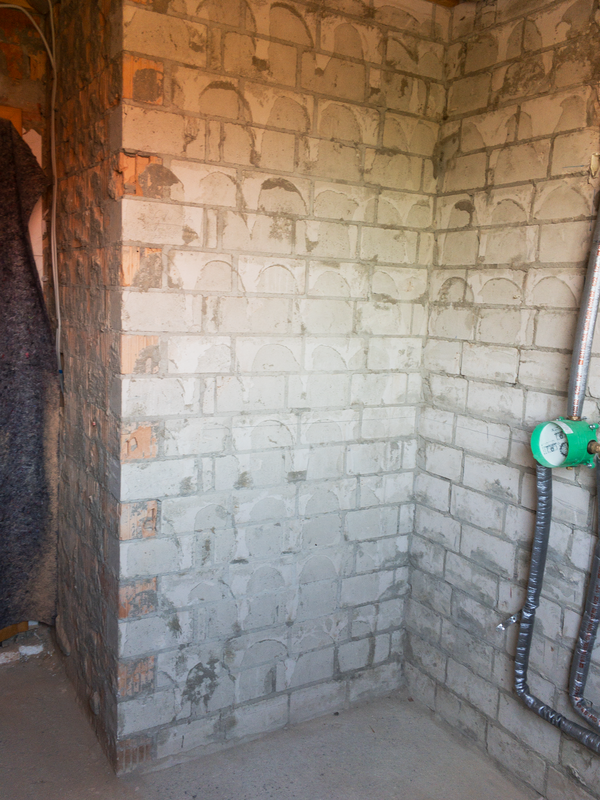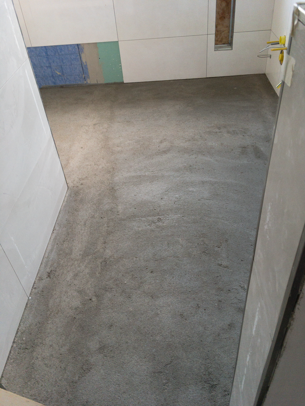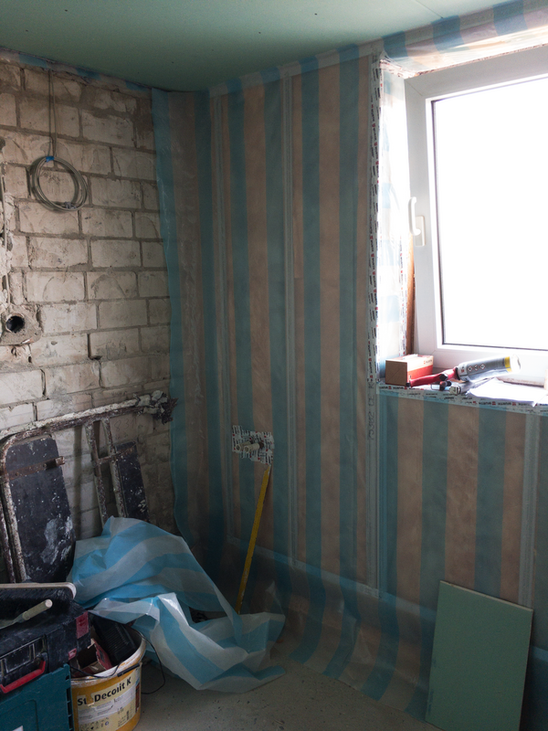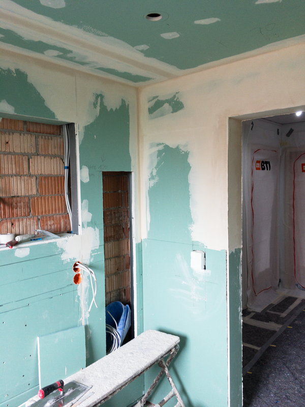 Für die Wandgestaltung werden die nicht gefliesten Wandflächen gespachtelt und geschliffen. Um den vom Kunden gewünschten Ballotini Metallic Putz aufzubringen muss, wie so häufig, der Untergrund vorbehandelt werden.