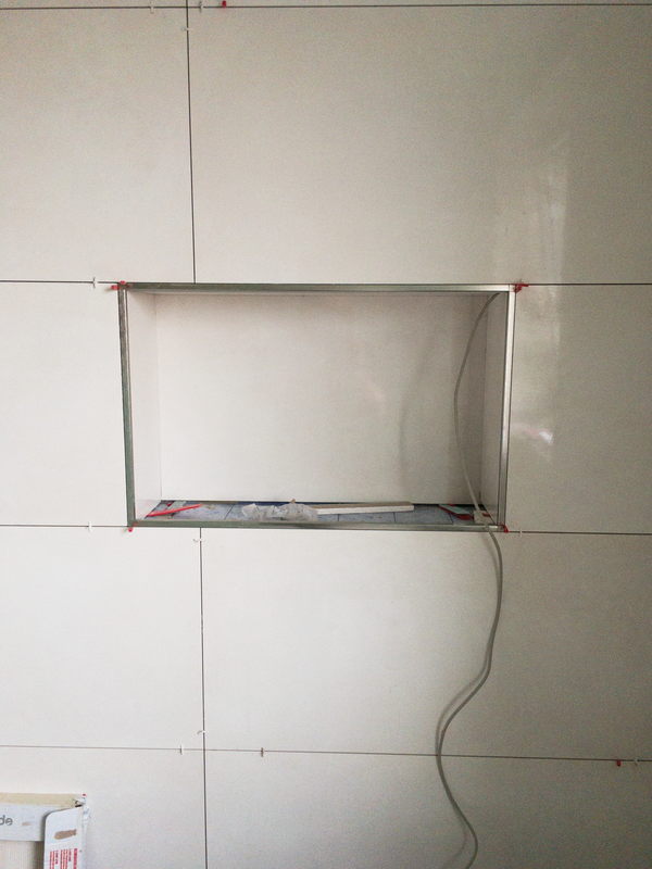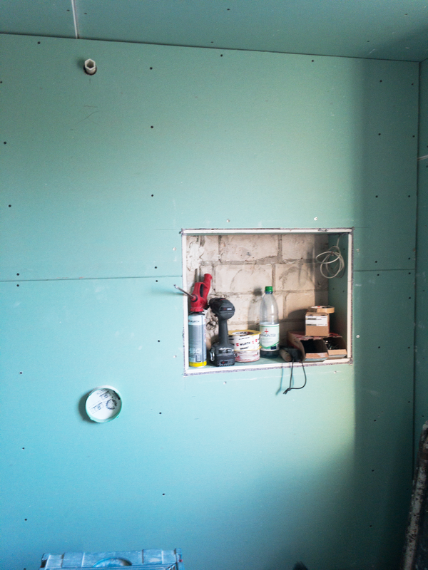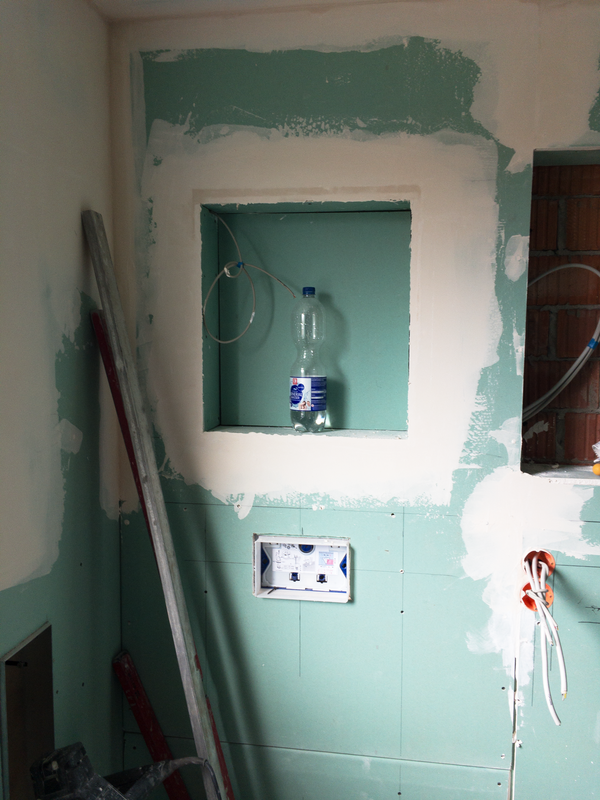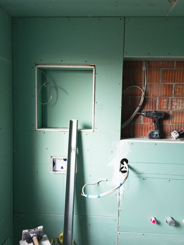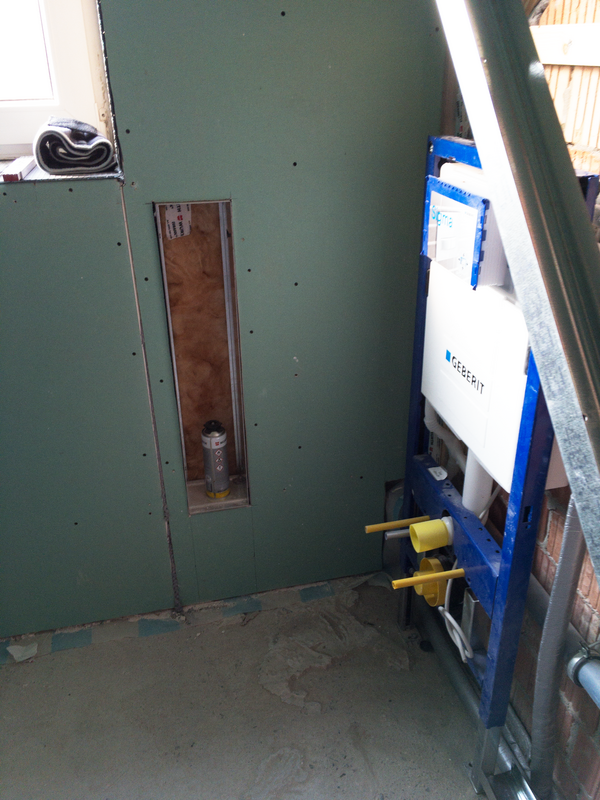 Um dem Kundenwunsch der Nischen in den Wänden des Duschbereiches, über dem WC und des eigelassenen Spiegelschranks gerecht zu werden, haben wir eine Trockenbauwand vorgezogen. Danach folgte die Montage des Einbaurahmes für das versenkte WC Modul. Nun konnten die Trockenbauplatten an den restlichen Wänden angebracht werden.