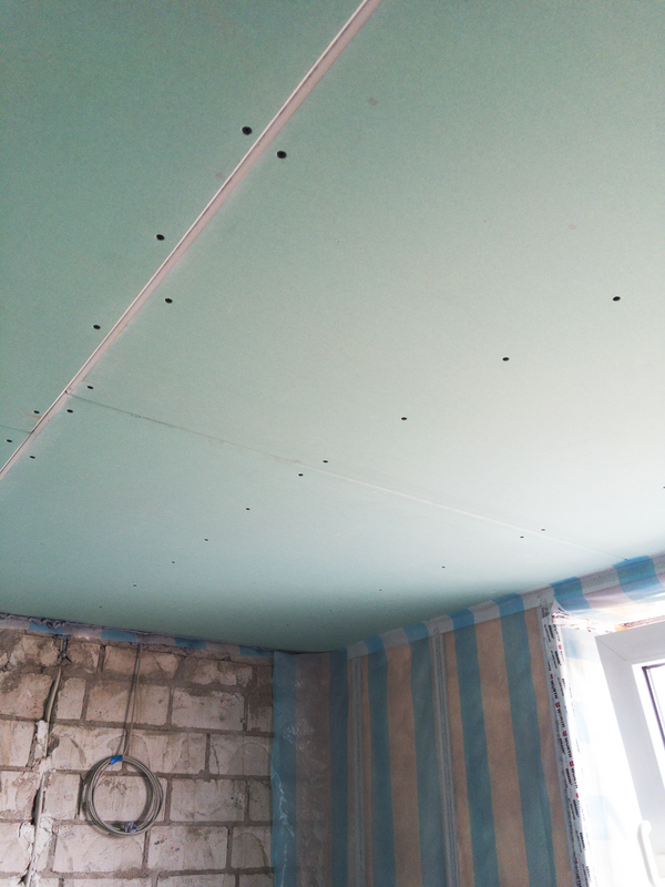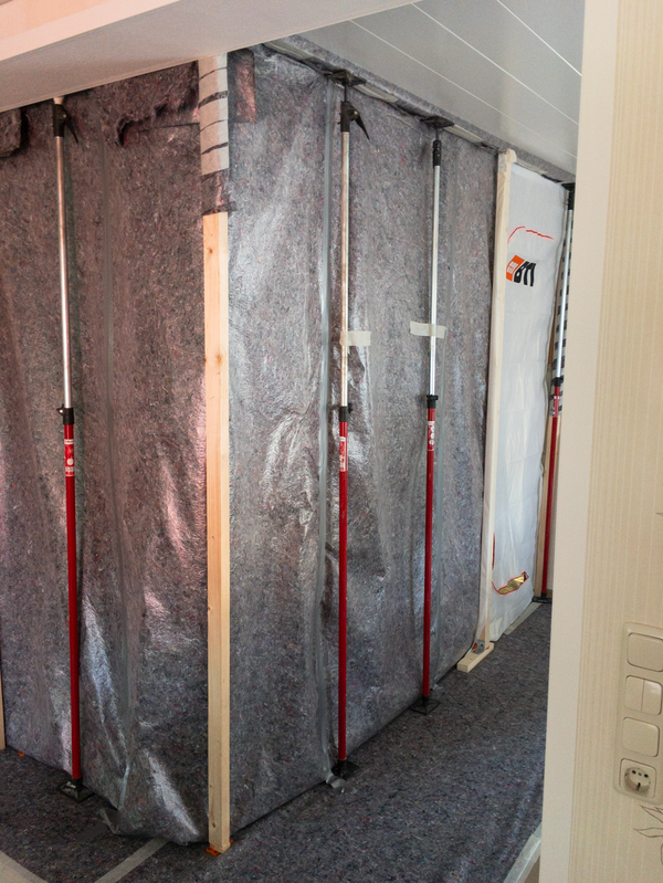 Die Dampfschutzsperre schützt die dahinterliegende Dämmschicht und die Bauteile vor eindringender Feuchtigkeit. Um später die Trockenbauplatten anbringen zu können, setzten wir eine Unterlattung an die Decke. Damit kein Wasserdampf in das Dämmmaterial eindringen kann, haben wir die Dampfschutzsperre an der Außenwand und der Decke angebracht. Danach befestigten wir die ersten Trockenbauplatten an der Decke.