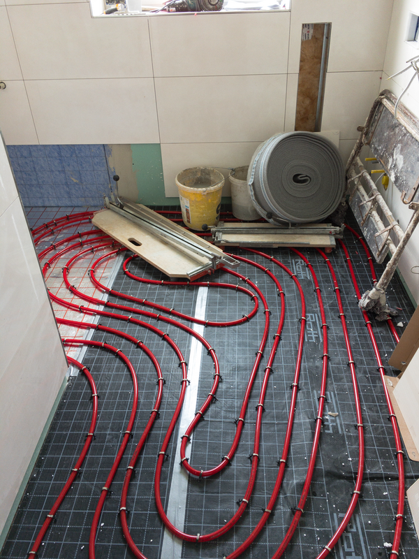 Eine Fußbodenheizung bietet sich vor allem im Badezimmer an. Für die Fußbodenheizung verlegten wir zunächst die Rohre für die Fußbodenerwärmung über den Heizungsrücklauf. Mit dem Verlegen des Dickbettes können wir vorhandene Unebenheiten im Untergrund ausgleichen und der Zement geht mit den installierten Materialien eine feste Verbindung ein.